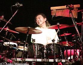 次の曲は和田、木村、渡辺のトリオで演奏する「Tremblin'」。渡辺のレガートなフレーズと和田の目まぐるしいフレーズが好対照を見せる導入部から熱の入ったソロを交換し合う中盤部、そして木村のドラムスがドライブする上を和田が弾きまくる場面では二人の気迫がぶつかり合ったハイ・テンションな演奏が堪能でき、またそこへ渡辺が入ってくる瞬間のカタルシスは見事である。その後のドラム・セクションでは和田と渡辺のリフの上を木村万作が鮮やかなスティックさばきで駆け抜け、それをばねにするかのように怒涛のエンディングへと突き進む感覚はえも言われぬ興奮であった。